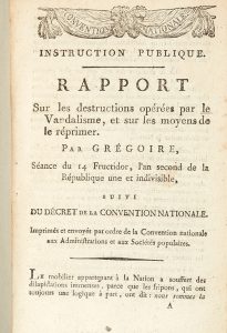 GREGOIRE (Henri). Rapport sur les destructions opérées par le vandalisme, et sur les moyens de le réprimer. Séance du 14 fructidor, l'an second de la République. Paris, Imprimerie nationale, [1794]. Plaquette in-12, cartonnage a la...