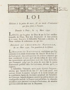 [GUILLOTINE]. Loi relative à la peine de mort, & au mode d'exécution qui sera suivi à l'avenir. Donnée à Paris, le 25 mars 1792. Paris, Imprimerie royale, 1792. In-4 de 4 pp., en feuilles. CONSTRUCTION DE LA "PETITE LUCARNE DONNANT SUR...