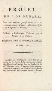 [MARINE]. Projet de loi pénale, pour être exécutée provisoirement dans les Armées navales, Escadres, Divisions, & sur les Vaisseaux de guerre. Paris, Baudouin, 1790. Plaquette in-8 de 22 pages, veau rouge souple, pièce de titre de veau beige et...
