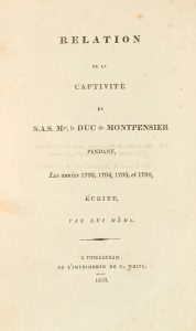 MONTPENSIER (Louis Antoine Philippe d'Orléans, duc de). Relation de la captivité de S.A.S. Mgr. le duc de Montpensier pendant les années 1793, 1794, 1795 et 1796, écrite par lui-même. Twickenham, de l'Imprimerie de G. White, 1816. In-8,...