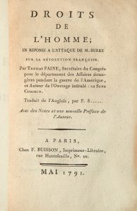 PAINE (Thomas). Droits de l'Homme ; en réponse à l'attaque de M. Burke. Traduit de l'anglois, par F. S... Avec des notes et une nouvelle préface de l'auteur. Paris, F. Buisson [puis : Buisson et Testu], mai 1791-1792. 2 volumes in-8, brochés,...