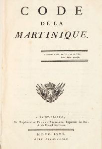VIII, 152 pp. 2 parties reliées en un volume in-folio, cartonnage de papier bleu, tranches mouchetées (reliure de l'époque). .esEditions original En 1729, un brevet d'imprimeur fut accordé dans l'ile de la Martinique au libraire Devaux pour l'impression des travaux de ville et des édits, "mais nous ne connaissons aucune impression sortie de cet atelier” (Deschamps L'Imprimerie hors l'Europe 1904, p. 158, ajoute : "ce n'est qu'en 1767 que nous pouvons citer un livre [le Code de la Martinique], qui, jusqu'à nouvelle découverte, est un incunable.”) De fait, le plus ancien imprimé est peut-être l'Affiche informant le public de la création d'une poste, 8 janvier 1739 (Voyage aux iles d'Amérique, Archives nationales, 1992, n° 147). Pierre Richard, établi à Saint-Pierre, venait de lancer en 1766, la Gazette de la Martinique. L'impression du Code, son opus magnum, lui vaut le titre de prototypographe des Antilles franfaises. LA MEMOIRE DE LA MARTINIQUE DANS LES PREMIERS TEMPS DE LA COLONIE. Jacques Petit de Viévigne, sénéchal et juge de l'Amirauté de Saint-Pierre, assura aussi la charge d'intendant par intérim. Il a de qui tenir, étant le fils d'Emilien Petit, né à Saint-Domingue, nommé par Louis XV au Bureau de législation coloniale ; on lui doit le premier traité de droit public colonial (1771), qui ne concerne en réalité que les Antilles franfaises. Le recueil, confu et rédigé selon un plan méthodique, est divisé en huit parties : Administration générale, Église, Militaire, Finances, Commerce, Marine, Justice, Police. Il est complété par une table chronologique des actes royaux couvrant la période 1642-1768, et par une table alphabétique des matières. Il n'existait pas de collections de textes concernant les premiers temps de la colonie, non seulement pour en rappeler l'histoire mais pour en fixer la législation, confinée dans une obscurité embarrassante pour les juges et redoutable aux parties, faute de jurisprudence codifiée. "La guerre continuelle que des insectes de toute espèce livrent aux papiers dans les dépots, & les différents fléaux dont cette isle a été successivement affligée, ont tellement jetté ces Loix dans le désordre et la confusion que la plüpart sont ignorées même de ceux dont elles sont la profession” (Avertissement). C'est ainsi que Jacques Petit fait reuvre de pionnier, avant même Moreau de Saint-Méry, auteur du recueil officiel pour Saint-Domingue (Paris, 1784-1790). IMPRESSION COLONIALE TIREE A PETIT NOMBRE, D'UNE GRANDE RARETE. En préambule à la nouvelle édition du Code de la Martinique (1807-1814), on relève déjà que l'édition originale était introuvable. Les Archives départementales et la médiathèque de la Martinique n'en possèdent pas d'exemplaire. Ex-dono manuscrit : Pour M. le chev. Du Grès, Lt du Roy au Cap. Chevalier de l’ordre royal et militaire de Saint-Louis, Louis de Pelisser du Grès était lieutenant du roi de la ville du Cap à Saint-Domingue à la fin du XVIIIe siècle. Sept annotations à la mine de plomb en marge sont à l’évidence de sa main : elles relèvent les ordonnances applicables à Saint-Domingue. En marge de l'ordonnance du 1er septembre 1761 concernant les affranchis, il a noté : "Applicable à St. Domingue avec restrictions”. BEL exemplaire, malgré le cartonnage usagé. Le Supplément, publié en 1772, est incomplet des pages 143 à 148. Un second supplément fut édité en 1786. (Dampierre, Essai sur les sources de l'histoire des Antilles franfaises 1904, pp. 198-199.- Leclerc, Bibliotheca Americana, n° 1436 : "Recueil important et fort rare".- Sabin, n° 61263.- Conlon, Le Siècle des Lumières, XV, 1995, n° 67 : 121 : deux exemplaires répertoriés : BnF et un seul aux États-Unis.- Non cité par Chadenat, Polak, Wroth & Annam).