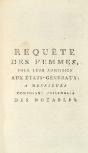dépit des sous-entendus grivois, la Requête exprime de véritables revendications (Albistur & Armogathe, Histoire du féminisme francais, 1977, p. 224). "Que les peuples barbares qui nous tiennent indignement renfermées dans des serrails, aient jugé à propos de nous exclure de toute administration, rien n'est moins étonnant (.). Mais qu'en France, où nous sommes le canal par où passent toutes les graces, & où nous faisons tout, on n'ait pas encore songé à nous admettre aux Etats-Généraux, on a de la peine à se le persuader. Il vous étoit réservé, Messieurs, d'effacer cet outrage, & de donner à l'Univers ce grand exemple de la galanterie franfaise.” (Gay III, 1009.- Conlon, Le Siècle des Lumières, XXIII, n° 88-2114 : 3 exemplaires cités).