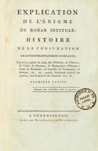 [ROUZET de FOLMON (Jacques-Marie)]. Explication de l'énigme du roman intitulé : Histoire de la conjuration de Louis-Philippe-Joseph d'Orléans. Vérédishtad [Paris], chez les marchands de nouveautés, sans date [avant 1814]. 4 volumes in-8,...