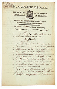 Restauration. Pièce signée "Royer” comme secrétaire greffier adjoint de la Commune de Paris, 1er octobre 1791. 2 pages et demie in-fol., en-tête et vignette de la Municipalité de Paris... Extrait du registre des délibérations du Conseil général de la Commune de Paris. CURIEUX DOCUMENT SUR LA DISSOLUTION DU COMITE DES RECHERCHES, PROCLAMANT LA FIN DE LA REVOLUTION EN OCTOBRE 1791 ! Exposé de M. LOHIER, Président du Comité des Recherches, rappelant que le Comité avait été institué en cas de conjonctures difficiles exigeant une surveillance rigoureuse : "En effet c'est le 22 octobre 1789, que selon l'arrêté de la Commune, ses représentans choisirent dans leur sein vos premiers Commissaires”. Mais les temps ont heureusement changé : "Par un bienfait marqué de la providence, nous voici au moment même où l'Empire franfois semble appeler toutes les nations à la liberté, en leur montrant la majestueuse Constitution”. Les droits du citoyen étant désormais assurés pour toujours par une législation inviolable, le Comité déclare sa mission terminée. Le Conseil général de la Commune, "considérant que la Révolution est terminée, que le règne de la Loi est établi, et que la surveillance et l'action ne doivent plus résider que là où la Constitution les a placés”, arrête que le Comité cesse toute fonction. Ses papiers seront inventoriés et déposés au Département de Police ; ses membres sont remerciés "du zèle, du patriotisme et de la prudence avec lesquels ils ont rempli le devoir pénible qui leur étoit imposé”. Ancienne collection de Mathieu-Guillaume Villenave (avec note autographe).