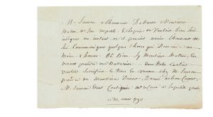 SANSON (Charles-Henri, 1739-1806) bourreau, il guillotina Louis XVI. Lettre autographe signée en tête "M. Sanson” et rédigée à la 3e personne, 31 aoüt 1790, à l'avocat maton. 1 page obl. in8. Tres rare lettre du celebre bourreau. "M. Sanson...