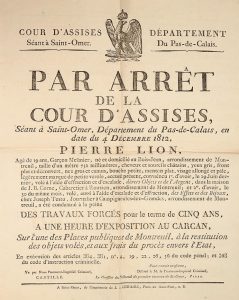 Arrêt de condamnation de Pierre Lion. Saint-Omer, 4 décembre 1812. Affiche imprimée, 62 x 42 cm. Grand placard imprimé. Pierre Lion, "Agé de 19 ans, garfon meünier, (...) cheveux et sourcils châtains, yeux gris, front plat et découvert, nez...