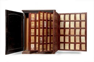 [AVIS DE RECHERCHE]. Trombinoscope criminel. [New York, vers 1880-1900]. Cabinet en bois (75,2 x 58,2 x 26 cm), porte ornée d'une peinture originale à l'huile ouvrant sur 10 portants pivotants, de 25 emplacements chacun, sur charnières, abritant...