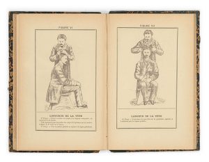 lithographies à pleine page. Ouvrage spécialement imprimé pour le congrès pénitentiaire international de Rome. Il ne figure pas au catalogue de la BnF. OUVRAGE FONDATEUR DE L'ANTHROPOMETRIé QUI DEVAIT RéVOLUTIONNER LES TECHNIQUES D'INVESTIGATION. Son auteur, le criminologue Alphonse Bertillon (1853-1914), mit au point au début des années 1880 son système d'identification fondé sur les mensurations du corps humain. Grâce à cette nouvelle classification des dossiers des criminels (qui n'étaient plus rangés par noms - la plupart étant faux - mais par mesures), il parvint à confondre de nombreux récidivistes. Son système, appelé bertillonage, fut adopté en 1883 par la police franfaise ; il lui valut par la suite une renommée internationale. A la description anthropométrique, il devait ajouter un système de photographie des suspects, de profil et de face. Adolphe Gronfier, qui fut commissaire de police à Paris de 1866 à 1893, a dressé un tableau vivant de cette nouvelle méthode : "Chaque matin, entre six heures et midi, toute la fournée des arrêtés du Dépöt est conduite par le collet jusqu'au service anthropométrique. On introduit les prévenus dans une grande salle sur les murs de laquelle ces mots sont écrits en grosses lettres : le silence est obligatoire. De petites stalles de bois scellées dans le mur font le tour de la pièce ; un portemanteau s'y trouve. Le prévenu öte sa veste et une de ses chaussettes. Il doit se présenter en bras de chemise devant les employés de bureau. Tandis qu'on l'installe sous la toise, il indique son nom, sa profession, son lieu de naissance. Tous ces détails sont inscrits sous sa dictée sur la fiche qui recevra ses mesures, son portrait et ses signes particuliers. On se sert pour mesurer la tête d'un compas d'épaisseur, pour le pied et le médius d'un pied à coulisse. C'est l'appareil des cordonniers un peu perfectionné. L'ensemble de ces opérations exige juste une minute. Il n'en faut pas trois pour contröler si le prévenu a déjà sa souche dans les dossiers du service et pour classer la fiche nouvelle à sa place respectueuse” (Dictionnaire de la racaille, 2010, p. 47). La reliure est usagée, mais l'intérieur est en parfait état.