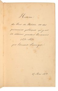 basane noire. TEMOIGNAGE INEDIT SUR LES DETENUS POLITIQUES AU FORT DE BICETRé, APRES LE COUP D'ÉTAT DU 2 DÉCEMBRE. Ce récit a été entrepris afin de dénoncer "les bruits odieux et calomnies répandus à cette époque dans le but d'exciter les passions des partis en faveur des détenus”. Parfaitement lisible, et dans une prose correcte, il semble être l'reuvre d'un officier du 37e de ligne de service dans le fort, et ayant accès à des documents intéressants qu'il cite in extenso : discours, certificats, lettres, rapport au Prince-Président du général de GOYON [commissaire extraordinaire du gouvernement pour les prisonniers politiques], etc. Il se compose d'une Préface et de 38 chapitres : les forts parisiens, récit du 2 Décembre, l'hospice de Bicêtre, transfert des prisonniers politiques, organisation du fort en prison, vie quotidienne des détenus, listes, etc. L'auteur conclut : "Tout ce que nous pouvons souhaiter, c'est que le Gouvernement de S.M. Impériale continue d'étendre sa sollicitude sur ces malheureux, et qu'éclairé par une plume indépendante et ferme, il opère dans notre région pénitentiaire, une réforme devenue nécessaire par l'exigence même de l'avenir de la société tout entière”.