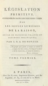 BONALD (Louis-Gabriel-Antoine, vicomte de). Législation primitive, considérée dans les derniers temps par les seules lumières de la raison, suivie de plusieurs traités et discours politiques. Paris, Le Clère, an XI -1802. 3 volumes in-8, basane...