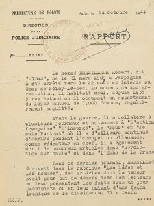 (Lobstein- Laurenchet). Édition originale. Un des 110 exemplaires sur papier alfa numéroté ; seul grand papier après 25 sur pur fil. Jugé le 19 janvier 1945 et condamné à mort pour intelligence avec l'ennemi après un procès de cinq heures, Robert Brasillach fut défendu par Maitre Isorni. Il fut exécuté le 6 février 1945 à l'âge de trente-cinq ans, malgré une pétition demandant la grâce présidentielle, signée notamment par Mauriac, Camus, Claudel, Valéry, Cocteau. Exemplaire unique Enrichi de pieces originales : - Fiche de police en date du 14 octobre 1944 : Le nommé BRASILLACH Robert, dit Midas,... En partie reprise à l'audience et p. 30 de l'ouvrage où l'accusé rectifie que Midas est le nom de l'échotier littéraire de Je suis partout. - 3 lettres autographes signées de Robert Brasillach, à en-tête de Je suis partout, datées aoüt et septembre 1943, également citées dans les débats. A l'adresse de Lucien Rebatet, l'écrivain expose ses opinions et les causes de sa rupture avec Je suis partout. "Je trouve ces lettres à Rebatet extrêmement intéressantes à tout point de vue, et, au fond, si on les utilisait honnêtement (ce dont je doute), beaucoup plus utiles que nuisibles à ma défense.” (Lettre de R. Brasillach à Me Isorni, 16 janvier 1945, citée dans les tëuvres complètesX, p. 603). - 1 lettre autographe de P. A. Cousteau adressée à Lucien Rebatet (4 pp., 7 septembre 1943) et citée dans l’ouvrage aux pages 146-147 : "Nous valons ce que nous valons mais notre coefficient est multiplié par J.S.P. Sans J.S.P. nous ne sommes plus que de petits bougres de journalistes ou d’écrivains sans auditoire ni influence réelle.” L’abandon du fascisme franfais au profit du nazisme avait provoqué, en aoüt 1943, le départ de Brasillach, remplacé par Cousteau et Rebatet, qui assurèrent la publication de Je suis partout jusqu'en aoüt 1944. (Julliard & Winock, Dictionnaire des intellectuels franfais, 2009, p. 757). Bel exemplaire.