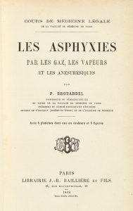 (1837-1906) était professeur de médecine légale à la Faculté de médecine de Paris. "In addition to the many articles he published on the subject of legal medicine and public hygiene, he wrote several authoritative books on various aspects of forensic medicine” (Heirs of Hippocrates, n° 2012). La collection comprend : - Les Asphyxies par les gaz, les vapeurs et les anesthésiques. Paris, Baillière et fils, 1896. l'autorite judiciaire concluait a un ; Brouardel relate avec precision plusieurs enquetes a propos de cas d'asphyxies .Edition originale .il s'agissait d'un simple accident ,parfois ,crime ou a un suicide quand L’illustration comprend 5 figures dans le texte, une planche en couleurs montrant le spectre du sang dans l’asphyxie par l’oxyde de carbone, une planche à double page montrant l’Opéra comique incendié (le 25 mai 1887 : 68 morts) et 6 planches représentant des cadavres. - L'Infanticide. Paris, Baillière et fils, 1897. " .Edition originale de l'un des livres les plus importants du docteur BrouardelIn the present work, Brouardel points out that infanticide was much more widespread in the British Isles and Continental Europe than was commonly believed. He knew how the French courts acted in cases of infanticide, and he emphasizes that the firensic expert must not render an opinion when testifying during an investigation of such deaths. (...) The expert must present only the facts” (Heirs of Hippocrates, n° 2012). L'illustration comprend un graphique, une planche à double page gravée en sépia par Debray, montrant quatre figures de crânes, et 14 reproductions photographiques dans le texte, dont 3 montrant des dépefages ou des débris d'enfants nouveau-nés. - La Pendaison, la strangulation, la suffocation, la submersion. Paris, Baillière et fils, 1897. Édition originale, ornée de 3 planches en couleurs hors texte, dont 2 montrant chacune un noyé sur une table de légiste, et de 43 figures dans le texte, la plupart représentant des scènes de pendaison. Reliures frottées.