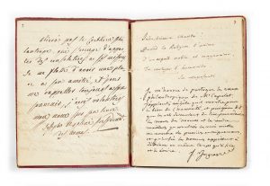 reliure de l'époque basane rouge, filet doré d'encadrement et motif décoratif à froid sur les plats, sous emboitage noir moderne. Liber AMICORUM d'un philanthrope, fondateur notamment de la salle d'asile d'Elbeuf, rempli de témoignages au cours de ses voyages en France et en Europe (Italie, Suisse, Espagne, Portugal, Russie, Allemagne, Belgique.), de prélats, médecins, peintres, écrivains, hommes politiques, administrateurs, etc. On relève notamment : C. Aubanel (directeur de la prison de Genève) ; Henri de BONNECHOSE, archevêque de Rouen ; Adèle de La Rochefoucauld, princesse BORGHESE Dr Giovanni ; BRUGNOLI (Bologne) ; le maréchal Thomas BUGEAUD Pierre de-Jean ; CAMPANA (Rome 1851) ; Arcise de CAUMONT Giuseppe ; COTTOLENGO Desiré-Joseph ; COURT Theophile ; DUMERSAN Adolphe-ntoineA ; DUPUCH le cardinal Adriano ; (eveque d'Alger) FIESCHI Louis-Charles ; GAMPERT (juge à Genève) ; Louis GAUTHEY (directeur de l'École normale du canton de Vaud) ; Franfois-Marius GRANET ; Dominique-JeanINGRES (vreux pour l'enseignement du dessin contribuant au bien de l'humanité) ; Noël Lefebvre-Durufle (ministre de l'Agriculture et du Commerce) ; Ferdinand de LESSEPS (Barcelone 1843) ; Dr Pierre-Nicolas malle (Strasbourg) ; Firmin MARBEAuevoquant la ) osephle cardinal J ; (creche divine de BethleemMEZZOFANTI duc de ,Napoleon Lannes-Louis ; Montebello Auguste de ; MONTFERRANDevoquant ) Leon ; (Isaac-sa cathedrale de SaintMOREL-FATlO (poème) ; Isidore POLINIERE Archimede-Felix ; (evoquant les salles d'asile de Lyon) POUCHET ; JamesPRADIER phonse deAl ; RAYNEVAL Ambroise ; Rendu (comme président de la Commission supérieure des asiles de France) ; Giuseppe RICCI (directeur des Incurables de Naples) ; Dr Philippe Ricord Martin-Pierre ; ROUX (Marseille) ; Giuseppe SACCHI (secrétaire de la commission directrice des salles d'asile d'enfants à Milan) ; prince de SAN GIORGIO (Naples) ; Giacomo SAVARESE (président de la députation générale des asiles à Naples) ; Victor SCHNETZ Eugene ; SCRIBE Xavier ; SIGALON Alexandre ; TORLONIA Giuseppe ; UGOLINI ; Horace vernet Barthelemy-Arthus ; VINGTRINIER (comme médecin en chef des prisons de Rouen) ; P.E. VISCONTI.etc ; On joint une carte a.s. de Capplet au "bon & brave General Gerard”, 7 juillet 1848, avec réponse a.s. au dos.