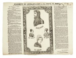 [CRIMINELS]. 2 manuscrits et 3 imprimés, XIXe s. Affiche d'une condamnation pour vol par la Cour d'assises de Grenoble, 1820. 2 affiches illustrées relatives au procès en cour d'assises, en 1840 à Bordeaux, du triple meurtrier Vincent ELlfABlDE...