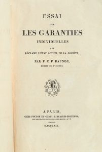 DAUNOU (Pierre-Claude-Franfois). Essai sur les garanties individuelles que réclame l'état actuel de la société. Paris, Foulon et Comp., 1819. In-8, cartonnage bleu à la Bradel, non rogné (reliure de l'époque). unique edition DU CHEF-D'ffiUVRE...