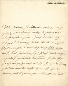 «Voilà, Madame, la lettre de VOLTAIRE. Vous pouvez meme si vous voulez, la garder mais ne la faites voir à personne. J'etois hier dans les rües par le beau tems, le beau chien de tems qu'il faisoit. Je me porte à merveilles. Mais sobrii estote dit St Paul, cestadire soyez sobres. Voila ce que je prendrois pour le texte d'un sermon, si j'en fais jamais; car puisque vous ne lisez plus que des sermons je suis bien tenté de ne plus faire aussi que des sermons; mais il faudra pour cela attendre le printems: car l'ennui de faire un sermon, & l'ennui du tems qu'il fait, sont de trop quand ils marchent ensemble.