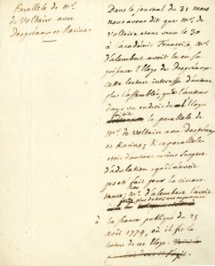 MANUSCRIT autographe, Parallele de Mr de Voltaire avec Despréaux et Racine, [début avril 1778] ; 1 page in-4, avec ratures et corrections.