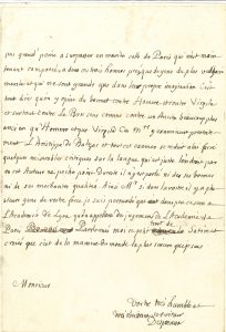 Homere et contre Virgile et surtout contre le Bon sens comme contre un Ancien beaucoup plus ancien qu'Homere et que Virgile. Ces Mrs y examinent presentement L'Aristippe de BALZAC et tout cet examen se réduit a lui faire quelques miserables critiques sur la langue qui est juste l'endroit par ou cet Auteur ne pèche point. Du reste il n'y est parlé ni de ses bonnes ni de ses mechantes qualités. Ainsi Mr si dans la vostre il y a plusieurs gens de vostre force je suis persuadé que dans peu ce sera a l'Academie de Lyon qu'on appellera des jugemens de l'Academie de Paris. Pardonnés moi ce petit trait de Satire»...