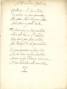 POÈME autographe, A Monsieur Pelisson ; 1 page in-4, adresse «Pour Monsieur Pelisson prez Mgr le proc[ureu] r gnal» avec cachets de cire rouge aux armes sur lacs de soie grise.