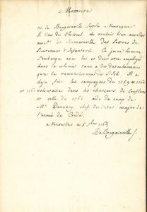 Mémoire demandant au duc de CHOISEUL de faire accorder au sieur de ROMAINVILLE des lettres de lieutenant d'infanterie. «Ce jeune homme s'embarque avec lui et doit etre employé dans la colonie tant a des detachemens qu'a la reconnoissance de l'Isle. Il a déjà fait les campagnes de 1759 et 1760 et 1761 volontaire dans les chasseurs de Conflans et celle de 1762 aide de camp de Mr Dennery chef de l'etat major de l'armée de Condé»...
