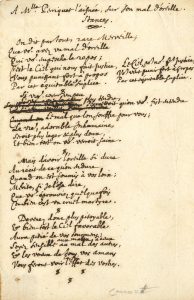 A Mlle Perriquet l’aisnée, sur son mal d’oreille. Stances (4 sizains), avec ratures et corrections à la deuxième strophe :