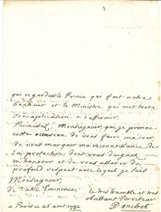 «L'académie françoise» a dû remettre une seconde fois le prix l'éloquence. Il lui adresse le discours qu'il a prononcé à la séance publique de l'Académie, à la Saint-Louis : «si ce discours a interessé l'assemblée, je le dois aux endroits qui regardent le Prince qui fait notre bonheur et le Ministre qui met toute son aplication a l’affermir»...