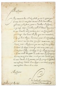 «Monseigneur Vous trouverez bon s'il vous plaist qu'avec le respect que je vous dois je vous fasse souvenir de la bienveillance qu'il vous a pleu faire esperer à l'autheur de Scipion, et qu'aussy comme Controlleur general de l'extraordinaire des guerres, je vous demande vostre protection pour mon Commis general que j'envoye dans l'armée du Roy que vous commandez, je luy ay donné charge de se tenir aupres de vostre personne pour recevoir tous vos ordres et y obeÿr exactement, ne doutant point, Monseigneur, que vous voulez bien conserver l'authorité des charges de ceux qui n'ont autre passion que de bien servir le Roy»...