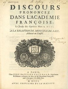 Discours pour les réceptions de VALINCOUR (1699), CAMPISTRON et MALEZIEU (1701), Louis de SACY (1701), le Premier Président POTIER DE NOVION (1724), TARGET (1785), l'abbé MAURY (1785), Claude de RULHIÈRE (1787).