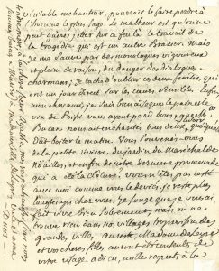 L'esprit est content, très content. Le cou d'albâtre étoit ébloüissant hier; le front n'a jamais été si pur, si noble. Ce porphyre veiné laissoit voir ce jeune sang circuler avec délices. J'ai dîné avec cette tour d'yvoire qui a été fixe et ambulante tour-à-tour, et dont l'esprit, véritable enchanteur, pourroit le faire perdre à l'homme le plus sage. Le malheur est qu'on ne peut guères jetter sur ce feu là le travail de la tragédie qui est un autre brazier. Mais je me sauve par des monologues vigoureux et pleins de raison, du danger des dialogues charmans»...