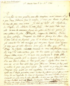 «Je ne sais ou vous prendre, mon cher Monsieur, mais comme il n'y a pas deux Voltaires dans le monde il n'est pas besoin de savoir ou vous etes pour vous ecrire. Je vous ay laissé le Sophocle, le Virgile, le Salluste de notre siecle. Sans cesser d'etre tout cela et avec de nouveaux degrés de gloire en tous ces genres, je vous retrouve de plus, Philosophe, vengeur de Newton, Maitre en saine politique, Precepteur des belles et favory des Rois. Rien de tout cela ne me surprend jay lû et admiré tout ce que jay pû recueillir de vos ouvrages qui ont paru depuis mon départ. Je nay pas eté assés heureux pour que la letre que Mde la Marq. du Chatelet m'avoit annoncée de vous me soit parvenue. Je n'ay de votre ecriture que sur des cartes qui valent bien de longues lettres. Encore si j'en eusse recu quelquune à Quito elles m'auroient peutêtre aidé à suporter le poids de mon affreux exil. Dix ans hors de France, et dans quels pays ! Le plus beau tems de ma vie et un tems assés long pour faire un savant, je lay passé à oublier le peu que javois apris. Jay vieilli et je n'ay pas vecu. Imaginés vous quelle est mon impatience de voir et d'entendre après une si longue privation; mais de tous les plaisirs que je me promets celuy de me raprocher de vous et l'espérance de vous dérober quelques moments est pour moy le plus sensible. Ce n'est pas une bonne année que je vous souhaite mais un siecle de vie pour l'honeur de la France et le bonheur de vos amis»...