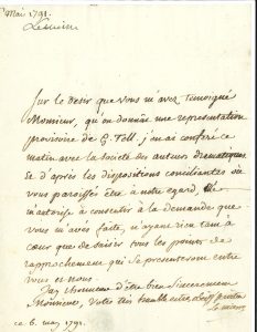6 mai 1791, à DAZINCOURT, à la Comédie française : la Société des Auteurs dramatiques autorise une représentation provisoire de Guillaume Tell, vu « les dispositions conciliantes où vous paroissés être à notre egard »…