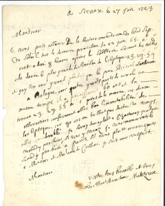 L.A.S. « Malezieu », Sceaux 27 juin 1723, à Giacomo Filippo maraldi, astronome du Roi, à l’Observatoire royal à Paris ; 1 page in-4, adresse avec contreseing « Le Duc du Maine », cachet de cire noire aux armes de ce dernier (manque le bas du f. d’adresse).