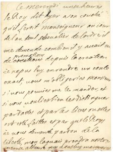 « Le Roy dit hyer a son couché qu’il feroit monseigneur au jour de lan seul chevalier de lordre et il me demanda combien il y avait eu de promotions depuis la creation. Je ne pus luy en rendre un conte exact, vous m’obligeries monsieur si vous pouvies me le mander, et si vous voulies bien les distinguer par dattes et par les lieus ou elles ont esté faittes et par quels Roys. […] Si vous aves la liste des chevaliers qui restent vivans vous m’obligeres de me l’envoier aussi pour voir si elle est conforme a la mienne et si je n’en oublie aucun »…