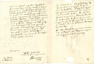 « Mon neveu le Sr EUDES a un proces au parlemt de Rouen, dans lequel il a pris a partie le procureur du Roy d’Argentan, parce que cet officier l’a mis en devoir de prise de corps comme le pretendant criminel d’un meurtre, dont il a pris grace, & dont le parlemt la justifié & luy a donné un arrest tout à fait favorable mais tres juste. Ce procureur du Roy estoit autrefois son amy, mais comme il a veu qu’il avoit acheté une charge d’enquesture au mesme siège d’Argentan, & que par le moyen de cette charge, qui est fort ancienne, mais qui estoit garanti depuis quatre ou cinq ans, mon neveu partageoit avec luy les profits & emoluments, quil estoit accoustumé a prendre luy seul, il est devenu son ennemy mortel, & remue toutes sortes de machines pour l’empescher d’entrer en ses droits. Il y va de l’honneteté du parlemt de maintenir son arrest, et la cause de mon neveu est de foy indubitable, toutefois bon droit a besoin d’aide, principalement en un endroit ou les brigands sont puissants. Nous y avons déjà quelques amis, mais j’espere beaucoup en celuy que vostre recommandation vous pourra donner »…