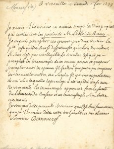 Versailles 1er février 1744. Il refuse de parapher les épreuves des Poésies de M. l’abbé de Bernis : « elles sont si deffectueuses qu’en bien des endroits le sens n’est pas intelligible », et il n’a pas les manuscrits de ces poésies…
