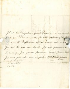 Il est tres singulier qu’une Dame qui a un mercredy n’ait point de nouvelles. Je m’en passerai. Je suis ici accablé d’affaires. Mon frere est mort [l’abbé Joseph de Secondat, doyen de Saint-Seurin]. Je ne lis pas un livre. Je me promene beaucoup, je pense souvent à vous, je vous aime. Je vous presente mes respects »…