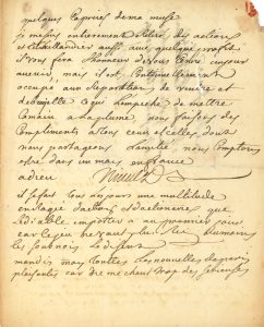 « Sera-t-il dit que vous n’écrirez que dans vos f. grimoires et que vous ne songerés pas a me feliciter, sur ma prodigieuse fortune, par la morbieu je sens lorgeuil qui me prend comme une envie de pisser, je suis d’avis de vous écrire de la manière que Dagobert parloit a ses chiens. Dittes moy un peu