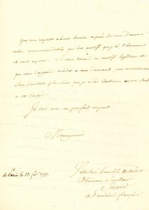 « Je suis occupé d’un grand ouvrage de littérature qui demande beaucoup de recherches et par conséquent de livres. La plupart de ceux de l’Imprimerie royale que le Roi s’est reservés et dont la disposition est confiée a votre sagesse, me seroient de la plus grande utilité, surtout l’Histoire naturelle, et le Recueil des ordonnances. L’encouragement des lettres et des gens de lettres est sans doute un des motifs de cette institution, j’ai cru […] qu’ayant un très grand besoin de livres pour un travail utile et très peu de moyens pour m’en procurer, je pourrois aspirer a participer aux dons que Sa Majesté veut bien en faire »…