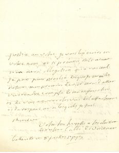 Belleville 8 juillet 1773. « Votre nom […] est fait pour aimer proteger et recompenser les gens de lettres », notamment leur ami LEMIERRE. Le Duc d’AIGUILLON « se connoit trop en gens de merite distingué pour ne pas rendre justice au votre »…