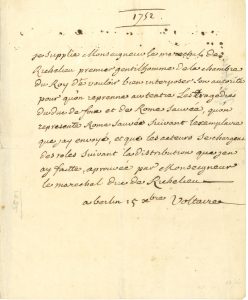 L.A.S. « Voltaire », Berlin 15 décembre [1752], au maréchal de RICHELIEU ; 1 page in-4.