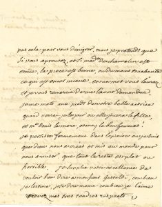 « Disposez ordonnez ; je pars avec douleur de Ferney [sic] ou jay basti un tres joli teatre, pour aller sur le territoire damné de Geneve qui a declaré la guerre aux téatres. Ne trouvez vous pas qu’il faudrait bruler cette ville ? En attendant que Dieu fasse justice de ces herétiques, ennemis de Corneille et du pape, je ferai transcrire l’œuvre des six jours [Olympie] tel quil est. Je ny veux rien changer. Je veux devoir les changements à vos conseils, et sur tout à limpression que cela fera sur le cœur de Madame de Chauvelin, car soit dit sans vous déplaire, tous les raisonements des hommes ne valent pas un sentiment d’une femme. Je ne dis pas cela pour vous dénigrer. Mais je pretends que si vous aprouvez, et si Made de Chauvelin est emüe, la piece est bonne, ou du moins touchante ce qui est encor mieux. En un mot vous l’aurez et je vous remercie de me l’avoir demandée.