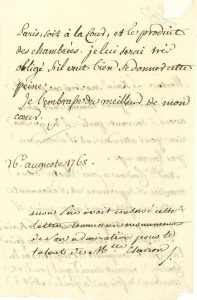 L.S. « V », 26 auguste 1765, à l’acteur Henri-Louis LEKAIN ; la lettre est écrite par son secrétaire Jean-Louis WAGNIÈRE ; 1 page et demie in-8.