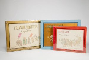 - L'Arche de Noé. Paris, Plon, sd. Petit in-4, oblong cartonnage demi-toile rouge à décor polychrome, tranches rouges (reliure de l’éditeur). Très bel exemplaire. -- 150 / 250 €