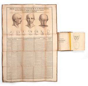 l'anthropologie, de la physionomie, etc. Paris, Delance, 1806. In-8, maroquin cerise janséniste, non rogné, étui (Alix). ,De l'Academie de médecine .ornee d'une planche depliante gravee figurant un crane humain vu sous trois angles differents ,Edition originale livre ici un des premiers exposes de la doctrine de son ami le docteur Gall sur la phrénologie qu'il (1844-1764)Baptiste Demangeon -Jean .1321 ,VII ,Monglond) .L'ouvrage renferme le rapport de la visite du docteur Gall dans les prisons de Berlin et de Spandau .popularisa en France .(planche repliee lIndique un frontispice et SUR LE FAUX TITRE, SIGNATURE AUTOGRAPHE : H. BEYLE. Très en vogue dans la première moitié du XIXe siècle, la phrénologie dépassa largement les cercles scientifiques, influenfant des écrivains comme Balzac, Goethe ou Stendhal. Ce dernier consulta le professeur Gall en 1813. Quelques années plus tard, il donna un compte rendu de son ouvrage Sur les fonctions du cerveau (1822-1825) dans des revues anglaises (Théoridès, Stendhal du cöté de la science, 1972, pp. 112-115). Mouillures. Restaurations marginales sur les premiers et derniers feuillets.