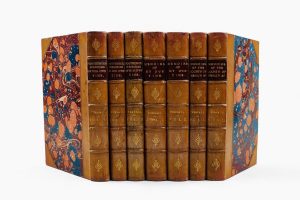 Soit un ensemble de 7 volumes en reliure homogène, demi-basane blonde post. (fin XIXe s.), dos à nerfs ornés, p. de titre en mar. brun. Portraits gravés hors texte. Qqs rousseurs. -- 120 / 150 €