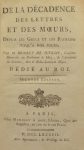 - RIGOLEY DE JUVIGNY, De la décadence des lettres et des mœurs depuis les Grecs et les Romains jusqu'à nos jours. Paris, Mérigot, 1787. In-12 veau ép., dos à nerfs orné. Coiffes et coins usés. -- 100 / 150 €
