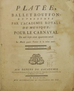 [Musique - RAMEAU (Jean-Philippe) & AUTREAU (Jacques)]. Platée, ballet bouffon representé par l'Académie Royale de musique, pour le Carnaval de mil sept cent quarente-neuf. [Paris], aux depens de l'Academie, 1749.