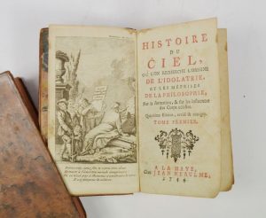 [PLUCHE (Abbé Noël-Antoine)]. Histoire du ciel, où l'on recherche l'origine de l'idolatrie, et les méprises de la philosophie, sur la formation des corps célestes & de toute la nature. Quatrième édition revûë & corrigée. La Haye, Jean Neaulme, 1744.