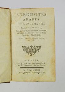 [DELACROIX (J. Fr.) & HORNOT (Ant.)]. Anecdotes arabes et musulmanes, depuis l'an de J.C. 614, époque de l'établissement de Mahométisme en Arabie, par le faux prophète Mahomet ; jusqu'à l'extinction totale du Califat en 1538. Paris, Vincent, 1772.